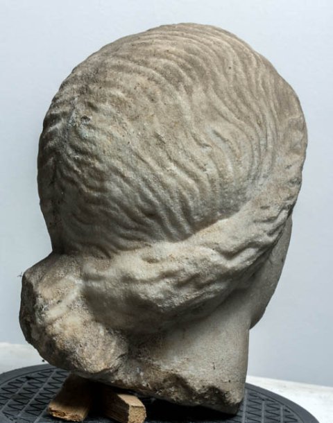 - Kopf einer Frau (Göttin ?) mit im Nacken zusammengebundenem Haar.