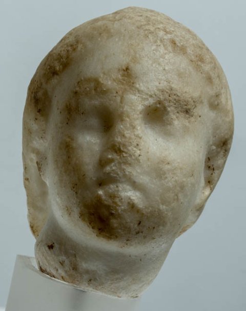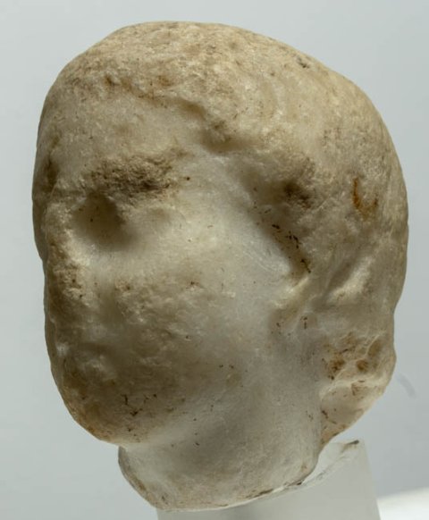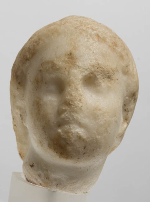 - Köpfchen eines kindlichen Knaben mit kurzem Haar, zu seiner rechten Schulter gedreht.
