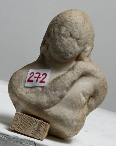 - Köper in Brusthöhe abgebr., vom linken Arm nur Ansatz erhalten, stark verrieben, in der Bruchfläche Bohrung