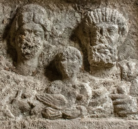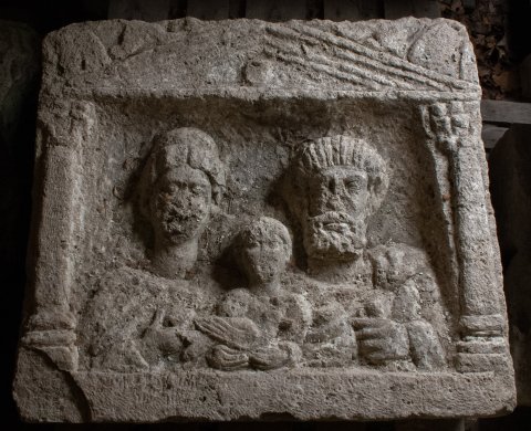 Hauptbild mit Familie : Zwischen Säulen Brustbilder eines Ehepaares mit Kind. Mann: bärtig, gesträhntes Haar, Toga contabulata, Rolle (volumen). Frau: Frisur der Faustina Maior. Knabe mit Vogel in den Händen.