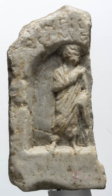 - In Bogennische stehender Mann im Mantel, über dem Bogen zweizeilige Inschrift.