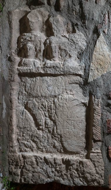 - Schriftfeld zwischen Säulen mit Spiralkanneluren. Darüber Bildfeld mit Brustbilden einer Familie. Sechs Personen, oben drei Erwachsene, davor drei Kinder.