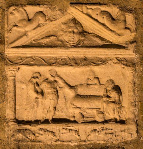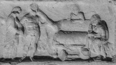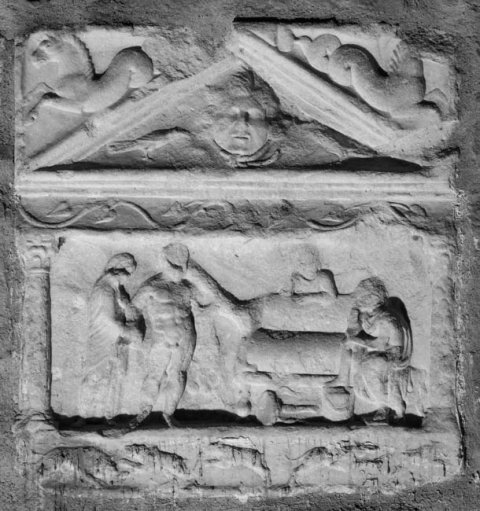 - Mythos: Herakles führt Alkestis zu Admet, der auf einer Kline sitzt, Fuß auf Ciste hochgestellt. Vor der Kline umgefallenes Tischchen, hinter der Kline eine sich auf die Lehne stützende Person. Unten Zwischenfries mit Tierjagd, seitlich Säulen mit Blattschuppen, darüber Fries mit Efeuranken. Eingeschriebener Giebel mit Gorgoneion zwischen Vögeln, auf den Giebelschrägen Meerwesen (Hippokamp).