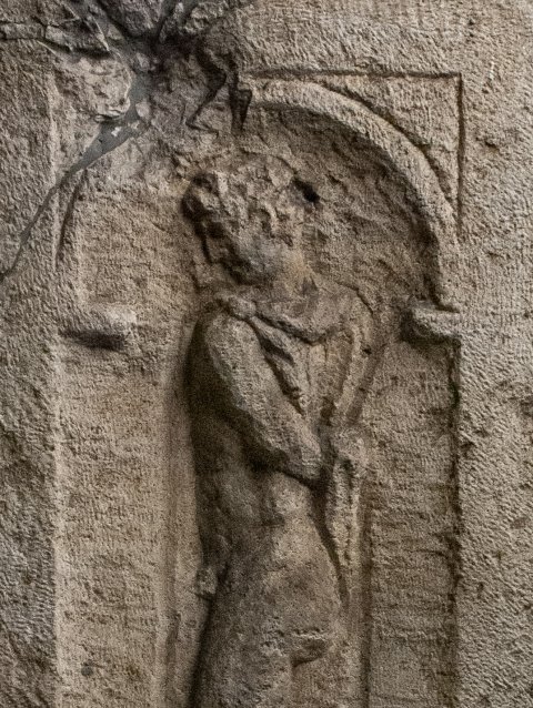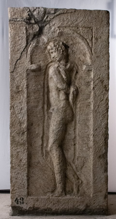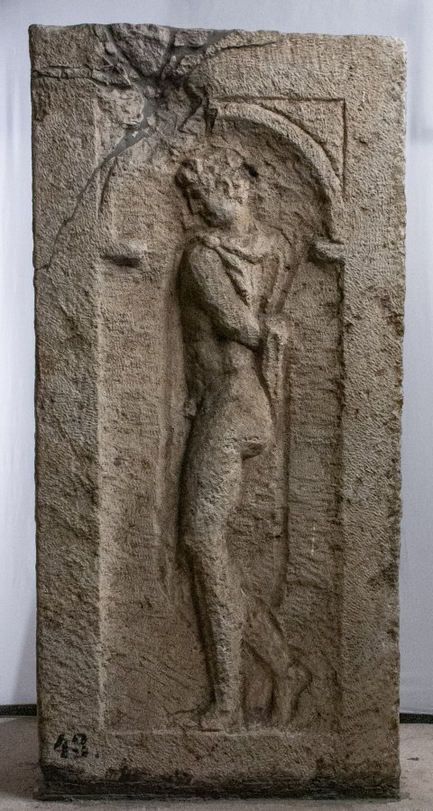 - Mythos (Iphigenie): unter Rundbogen stehender gefesselter Jüngling (Orest in Tauris).