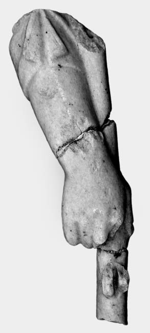 - Mythische Figur (Göttin): rechter Unterarm mit Rest eines Ärmels, die Hand hält einen Stab.