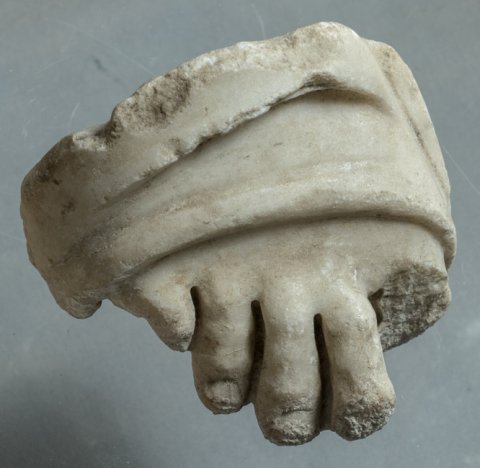 - Mythische Figur (Göttin): nackter rechter Vorderfuß, von Gewandsaum bedeckt.