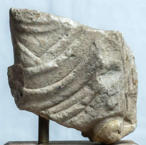 - Mythische Figur: Oberschenkelpartie einer stehenden männlichen Figur (Genius ?) mit Hüftmantel, Am rechten Oberschenkel Ansatz eines Objekts (Altar ?).