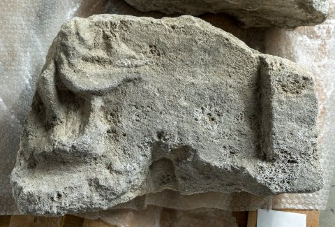 - oben u. links abgebr., unterer Rahmen verbr. mit Dübelloch. Rückseite gerahmt (2fach verwendeter Block).