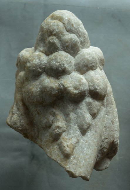 - Mythische Figur: Oberteil eines Füllhorns mit Früchten und Weinblatt, von einer Fortuna- oder Genius-Statuette.