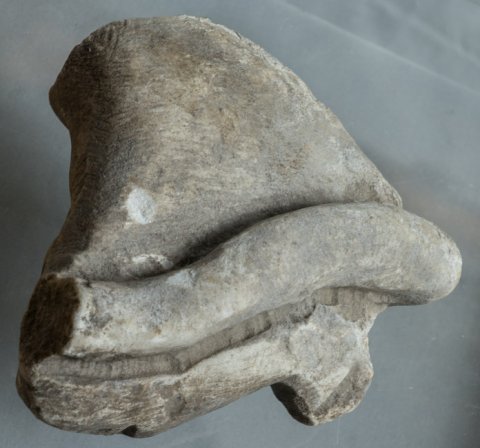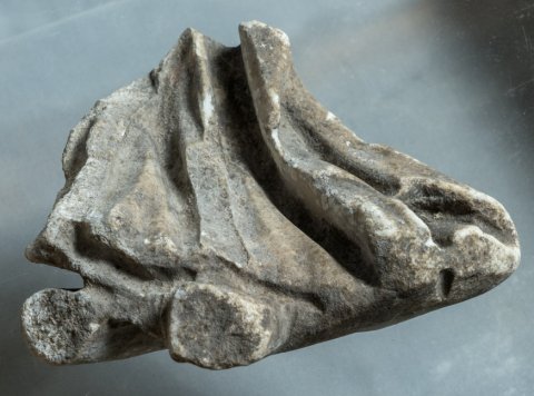- Flatternde Gewandfalten mit Saum, auf der Rückseite Rest einer Schlange ?