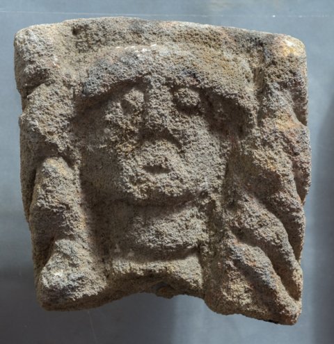 - Stilisiertes menschliches Gesicht mit Haube (?), grahmt von schrägen Wülsten, die auf die Nebenseiten umbiegen.