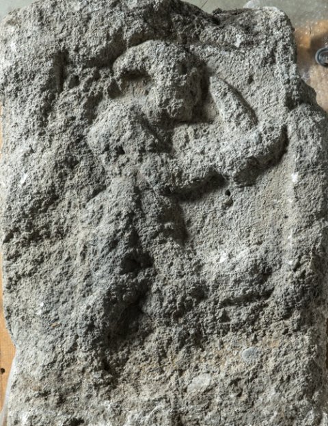 - Gerahmtes Bildfeld mit nach rechts gehender nackter (?) männlicher Figur mit spitzer Kopfbedeckung (?), rechter Arm vorgestreckt, linker zum Kopf erhoben.