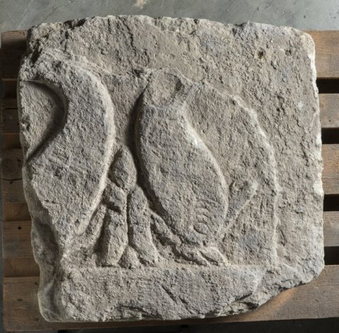 - Platte mit Rahmenleiste unten, darauf zwei antithetische Delphine, zwischen ihnen Blütenkelch (?).