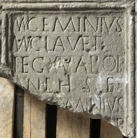 M(arcus) Geminius / M(ani) Cla(udia) vet(eranus) / leg(ionis) XV Apol(linaris) / an(norum) L h(ic) s(itus) e(st) / M(anius) G[e]minius Aria p[atrono] p(osuit)