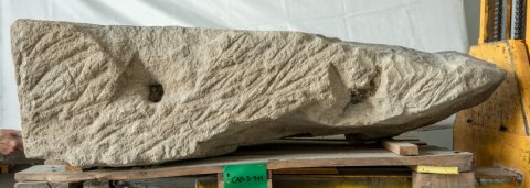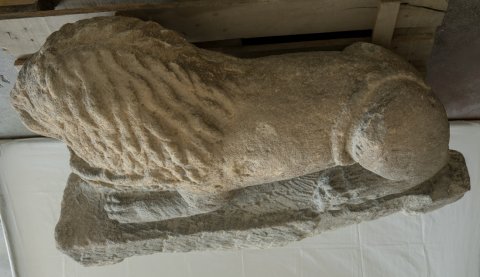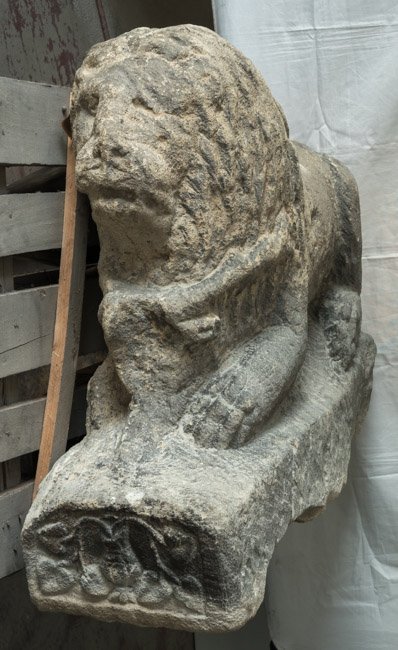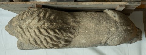 - Auf Plinthe liegender Löwe, zwischen den Vorderpranken Hirschkopf. Auf der Stirnseite der Plinthe Gefäß mit Efeuranken.