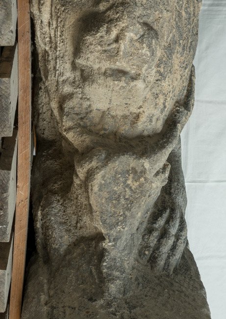 - bestoßen, verwittert, Hirschkopf abgebr., in der Unterseite Dübelloch