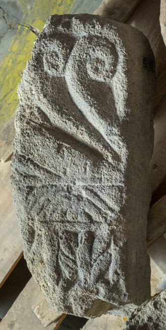 - Eingeschriebener Giebel mit Palmettenakroter, unter dem Giebel ornamentaler Fries und Rest eines Pilasters (Kapitell ?) mit Blattdekor.