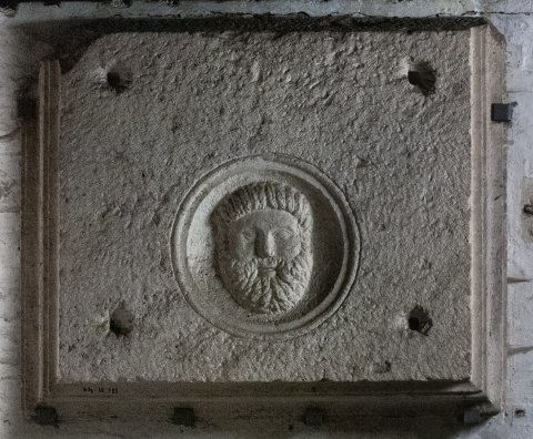- Decke : Platte mit Profilierung auf drei Seiten. Im Zentrum eingetieftes, profiliert gerahmtes Medaillon mit bärtigem Kopf (Saturn ?).