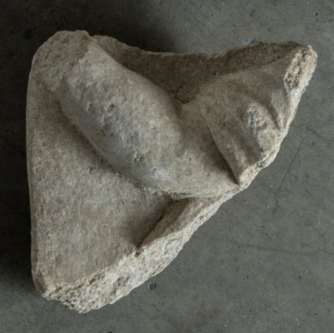 - nach oben abgewinkelter Arm, auf dem Oberarm Gewandreste