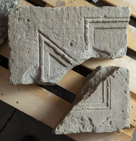 - Platte mit profiliert gerahmter tabula ansata, Schriftfeld, soweit erhalten, leer.
