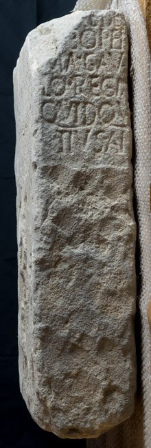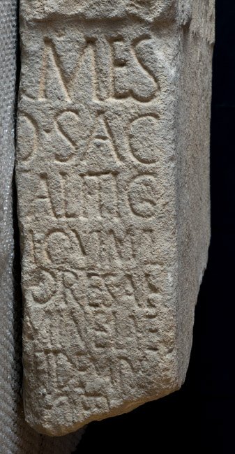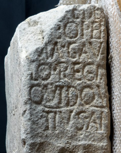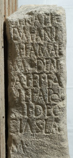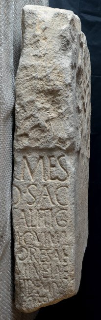 - vertikal zerschnittenes Monument: 2 nicht anschließende Fragmente des oberen Teils, unten abgebr., Zone über der Inschrift abgearbeitet; 2 nicht anschließende Fragmente des unteren Teils, oben abgebr., Zone unter der Inschrift abgearbeitet.