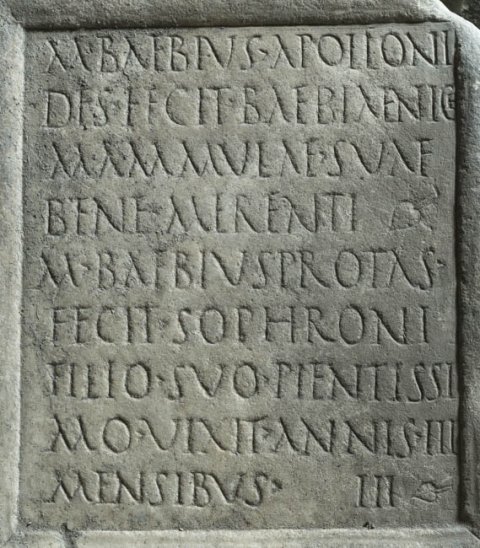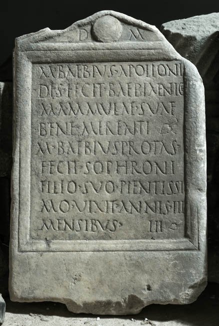 - D(is) M(anibus) // M(arcus) Baebius Apolloni/des fecit Baebiae Nice / mammulae suae / bene merenti / M(arcus) Baebius Protas / fecit Sophroni / filio suo pientissi/mo vixit annis III / mensibus III