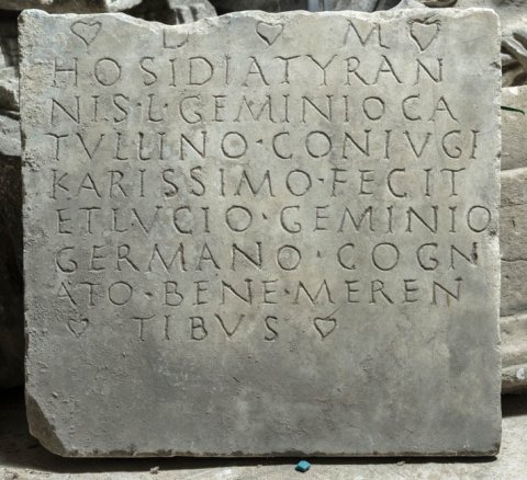 - D(is) M(anibus) / Hosidia Tyran/nis L(ucio) Geminio Ca/tullino coniugi / karissimo fecit / et Lucio Geminio / Germano cogn/ato bene meren/tibus