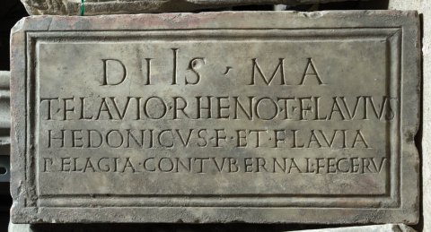 - Diis(!) Ma(nibus) / T(ito) Flavio Rheno T(itus) Flavius / Hedonicus f(ilius) et Flavia / Pelagia contubernal(is) feceru(nt)