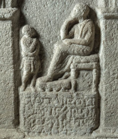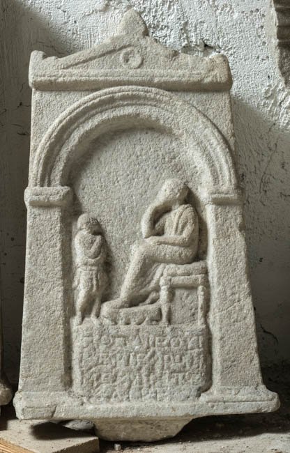 - Giebel mit Akroteren, im Giebelfeld Schale. Bildfeld unter profiliertem Bogen auf Pilastern. Postament mit Inschrift, darauf lehnenloser Sessel mit Schemel. Sitzende Frau (?), vor ihr stehender Knabe (Diener ?).