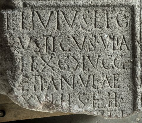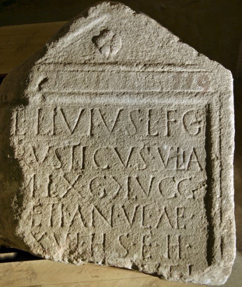 - L(ucius) Livius L(ucii) f(ilius) Ga(leria) / Rusticus Ulia / m(iles) l(egionis) X g(eminae) (centuria) Lucc/(r)eti(i) an(norum) VL ae(rum) / (X)XVI h(ic) s(itus) e(st) h(eres) / [ex t(estamento) f(aciendum) c(uravit) s(it) t(ibi)] t(erra) l(evis)
