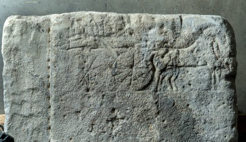 - Wagenszene - Ritzzeichnung: vierrädriger offener Wagen mit Fahrgästen (?), Kutscher und Zweigespann.