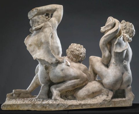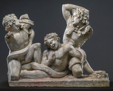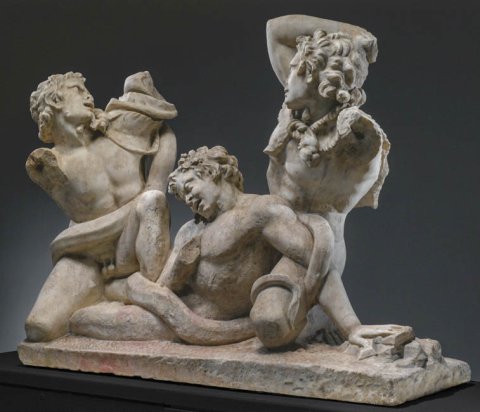 - Mythische Figuren: drei Satyrn kämpfen gegen eine Schlange, Pardodie der Laokoon-Gruppe.