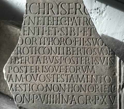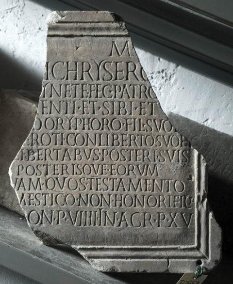 - [D(is)] M(anibus) / [---]i Chrysero[tis] / [--- S]ynete fec(it) patro[no] / [me]renti et sibi et / [---] Doryphoro fil(io) suo e[t] / [---]eroti conliberto suo et / [libert(is)] libertabus posteri(s) suis / posterisque eorum / [praeterq]uam quos testamento / [meo do]mestico non honorifica(vero) / [l(ocus) m(onumenti) in fr]on(te) p(edes) VIIII in agr(o) p(edes) XV