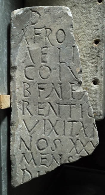 - D(is) [M(anibus)] / Afrod[isiae] / Aeli[anus] / co(n)iu[gi] / bene m[e]/renti q[uae] vixit an/nos XXX[---] / mens(es) I[---] / die[s ---]