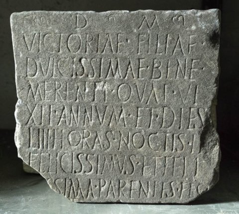 - D(is) M(anibus) / Victoriae filiae / dulcissimae bene / merenti quae vi/xit annum et dies / LIII horas noctis II / Felicissimus et Feli/cissima parentes fec(erunt)