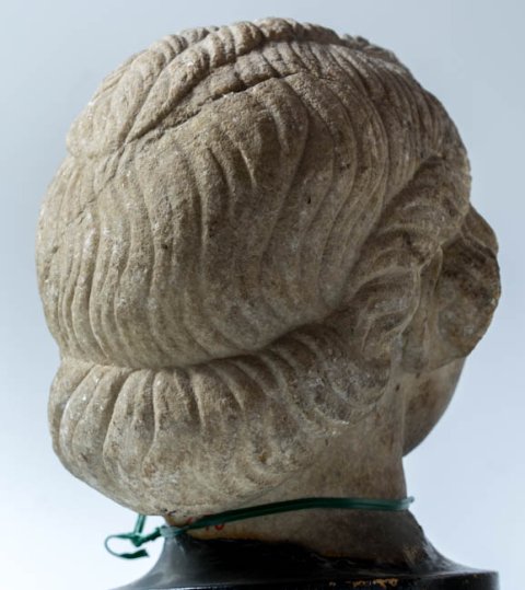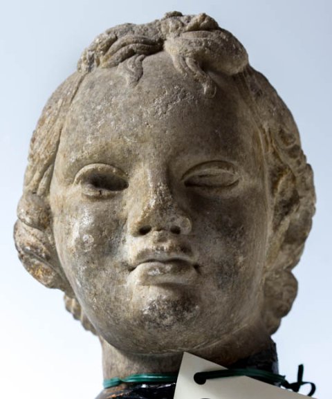 - Knabenkopf (Eros) mit Scheitelzopf und im Nacken aufgerolltem Haar. Augen waren eingelegt.