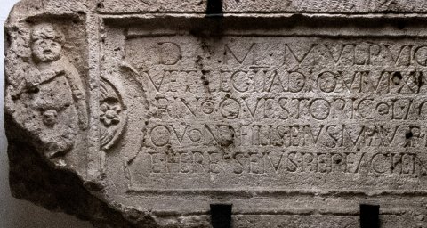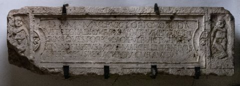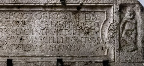 - D(is) M(anibus) M(arco) Ulpio Victori quonda(m) / vet(erano) leg(ionis) II adi(utricis) qui vix(it) ann(os) LV et M(arco) Ulp(io) Victo/rino qu(a)estori col(oniae) Aq(uincensis) et Ulp(iae) Victorin(a)e / quond(am) fili(i)s eius M(arcus) Aur(elius) Marcellinus nepos / et heres eius perfaciendu(m) curavit