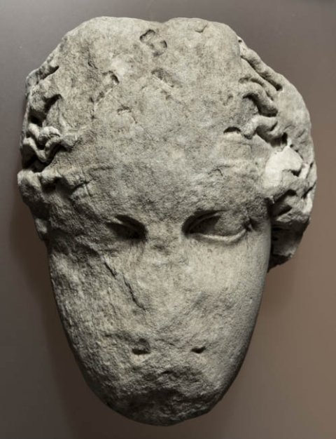 - Mythische Figur: Kopf des jugendlichen Dionysos mit Blätterkranz (Efeu ?) im Haar.