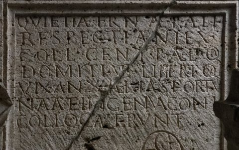 - D(is) M(anibus) / quieti aeternae P(ublii) Aeli(i) Respectiani ex coll(egio) cent(onariorum) P(ublii) Aeli(i) q(uon)d(am) / Domiti(i) vet(erani) libert(i) qui / vix(it) an(nos) XXX Aelias Fortu/nata et Ingenua conl(ibertae) collocaverunt / optamus s(it) t(ibi) t(erra) l(evis)