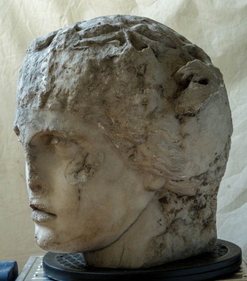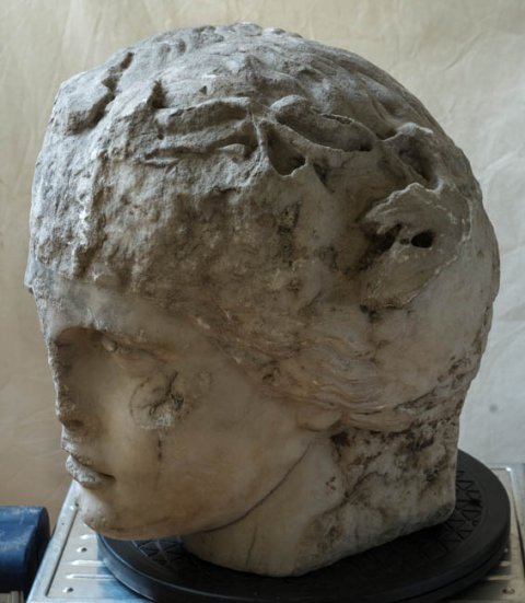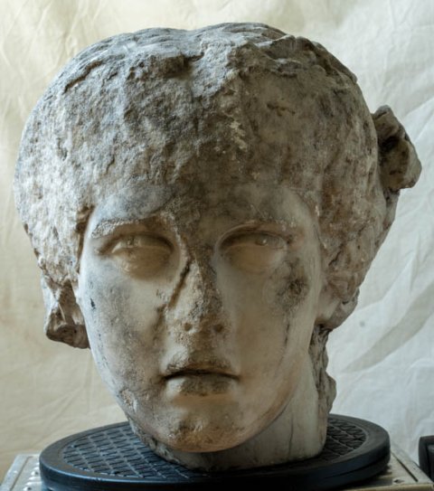 - Mythische Figur: überlebensgroßer Kopf des jugendlichen Dionysos mit Weinlaubkranz.