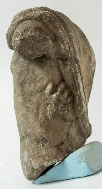 - Torso mit Ansatz des linken Oberarms, Hals, rechte Schulter abgebr., Oberfläche verwittert