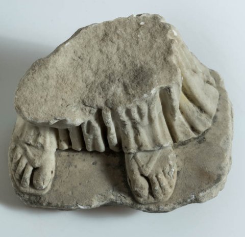 - Stehende Frau in Chiton und Mantel, Füße in Sandalen, rechter Fuß etwas angehoben.