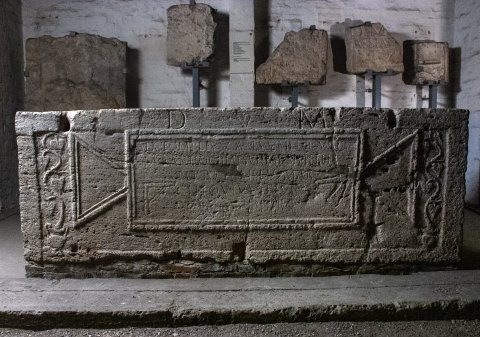 - Inschrift in Tabula ansata zwischen Krateren mit Efeuranken. Im Schriftfeld Werkzeuge: links unten Winkel, rechts Axt (ascia).