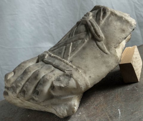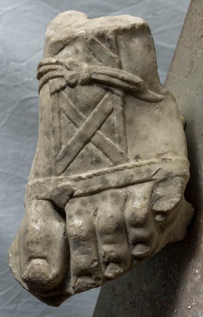 - Männliche überlebensgroße Figur: linker Fuß in geschnürter Sandale.