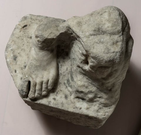 - Plinthe mit linkem nackten Fuß, daneben Fels (?)