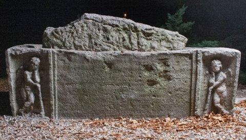 - Schriftfeld zwischen Nischen mit geflügelten Knaben auf niedrigem Podest, auf gesenkte Fackeln gestützt (Trauergenius).