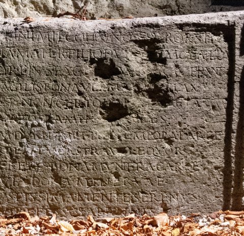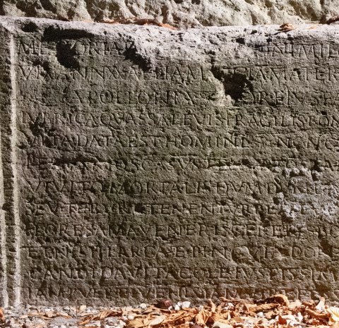 - Memoriae Q(uinti) [Ael(i) Apoll]oni mil(itis) coh(ortis) (milliariae) nov(a)e Suror(um) stip(endiorum) IIII / vix(it) ann(os) XX Aelia Marcia mater filio dulcissimo et Aelia Apollonia soror eius faciendum curaverunt / Lubrica quassa levis fragilis bona vel mala fallax / vita data est homini non certo limite cretae / per varios casus tenuato stamine pendes / Vivito mortalis dumdum dant tibi tempora Parcae / seu te rura tenent urbes seu castra vel (a)equor / flores ama Veneris Cereris bona munera carpe / et Nysii larga et pinguia dona Minervae / candida(m) vita(m) cole iustissima mente serenus / iam puer et i(u)venis iam vir et fessus ab annis / talis eris tumulo superumque oblitus honores