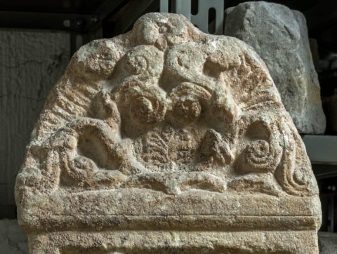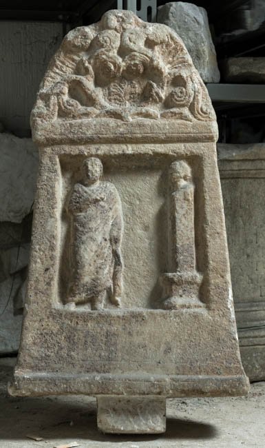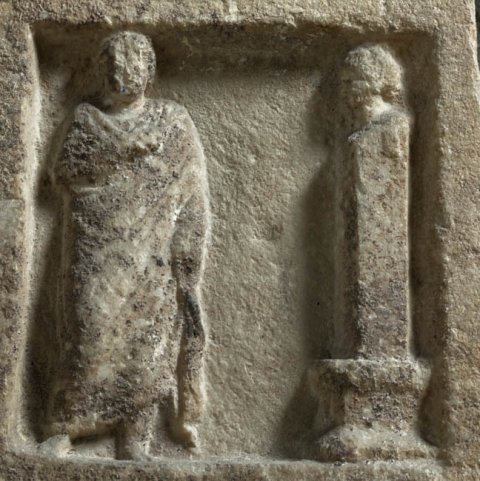 - Oben abgerundeter Giebel mit Akanthusranken. Bildnische mit frontal stehendem Mann im Mantel, rechts Herme.