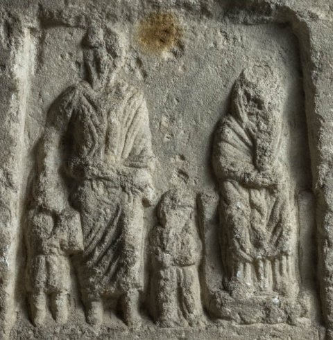 - Familie: drei stehende Personen (Kind-Knabe mit Kästchen oder Gefäß, Mann, Kind-Mädchen), rechts frontal sitzende Frau.