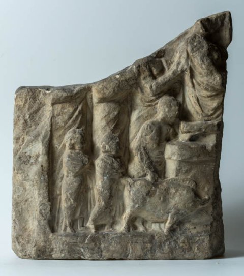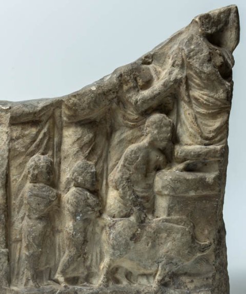 - Zug von drei Adoranten, im Vordergrund zwei Kinder im Mantel, vor ihnen Opferdiener mit Schwein und Schale (?) auf der linken Hand. Vor dem Diener Altar, darüber Rest einer nach rechts hin sitzenden Figur (Teil einer Göttergruppe).